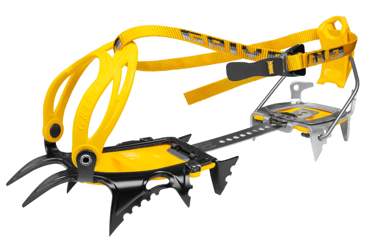 Hybrid crampon with steel front part and light alloy back part, for light and fast mountaineering.