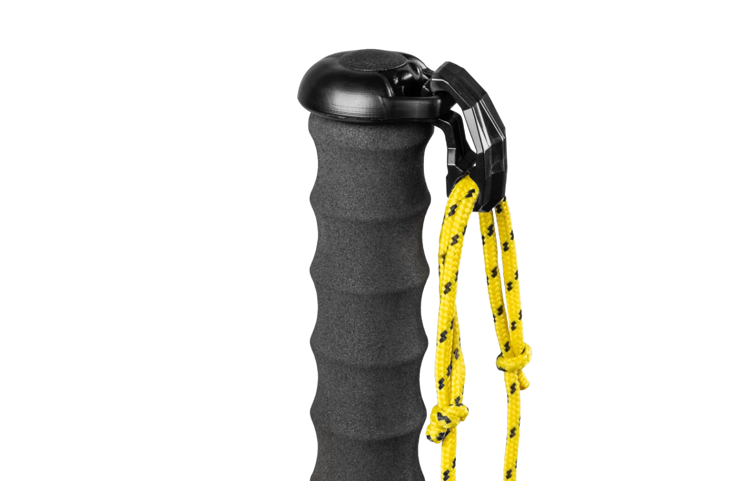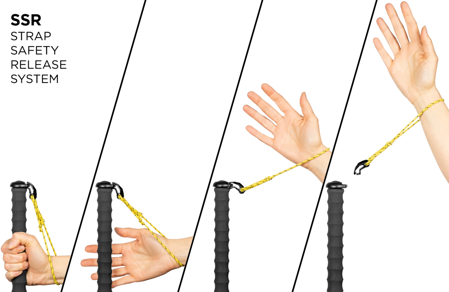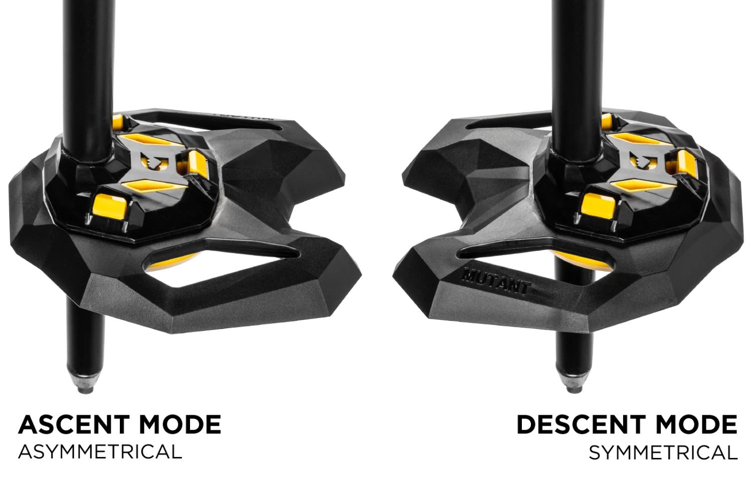 The new Mutant Basket (which can be used in ascent mode – asymmetrical and also in descent mode – symmetrical) makes it unique for its ability to adapt to any type of skiing situation. Its long ergonomic foam handle allows you to move your hand in the various holding positions. It has an adjustable minimal cord-strap and the innovative SSR (Strap Safety Release) System: it is tight when pulled downwards or outwards, but it releases when it is pulled upwards (above 90°).