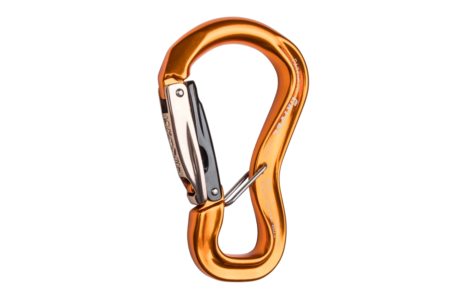 – flat in the lower part to follow the shape of the webbings of the belay loops, with “captive” safety wire to avoid “cross loading” or positioning along the minor axis of the carabiner, which would greatly reduce its strength