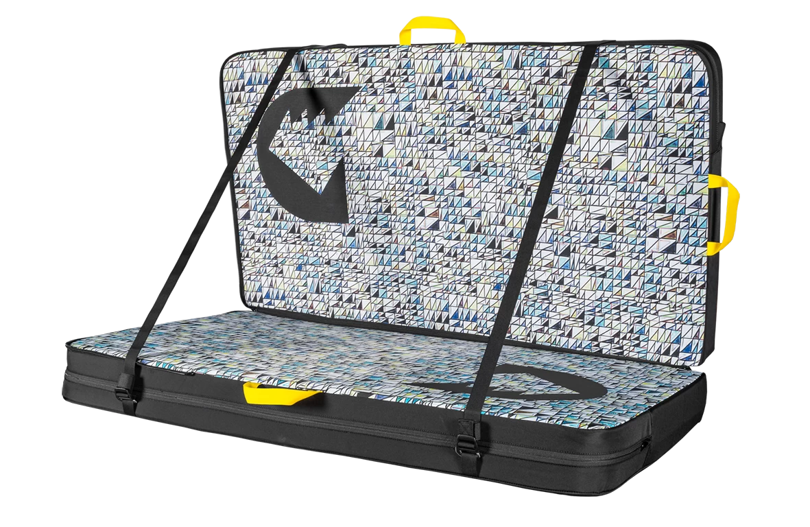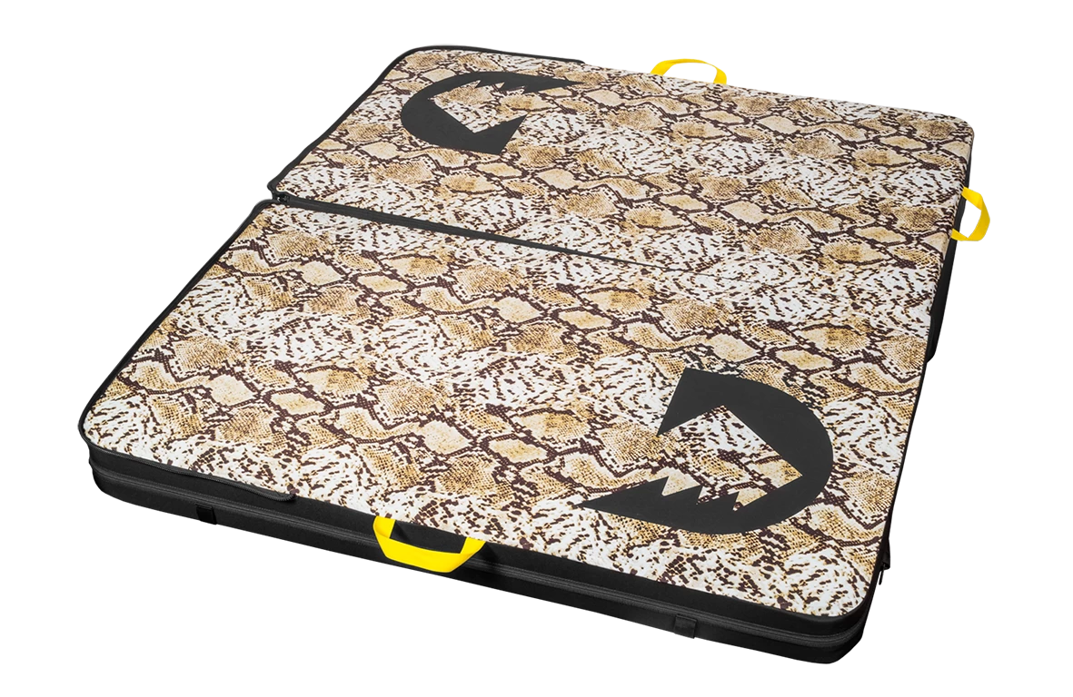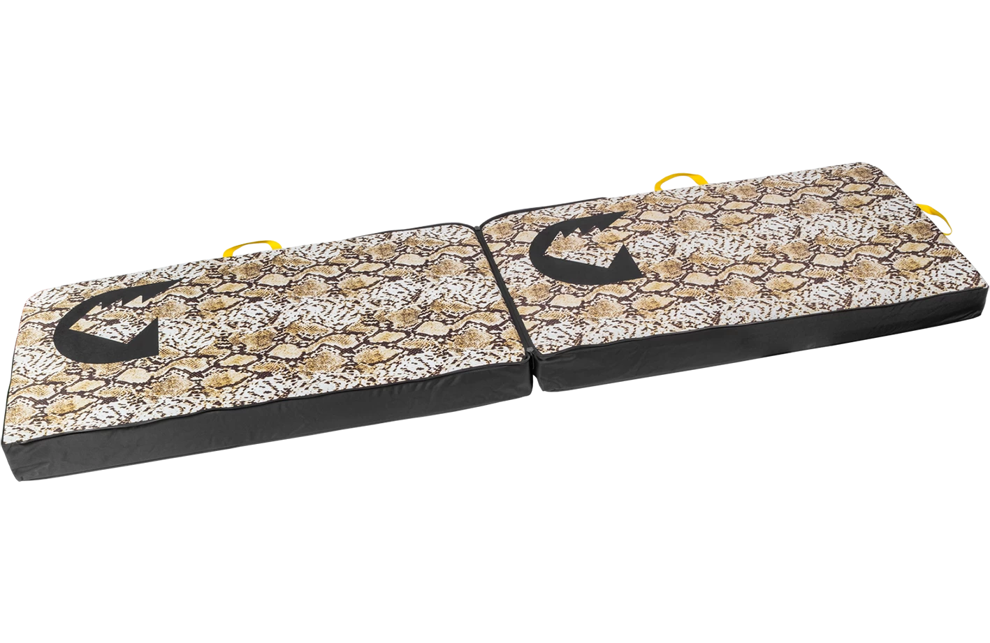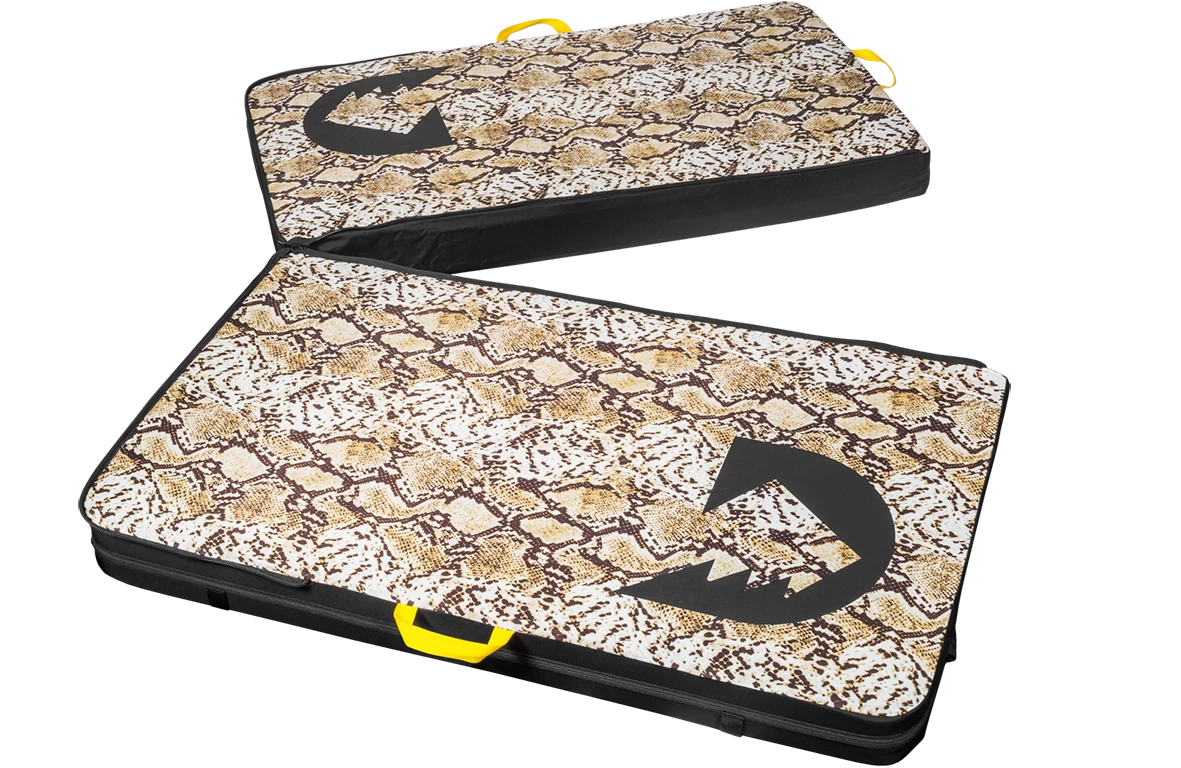 This versatile crash pad can be zipped together side by side (120×110) or lengthwise (230×60). It can be carried via two adjustable shoulder straps. It features two practical handles to move it and can be set as a seat. Available in 2 fashion styles (Abstract or Python), or the classic Grivel color version.